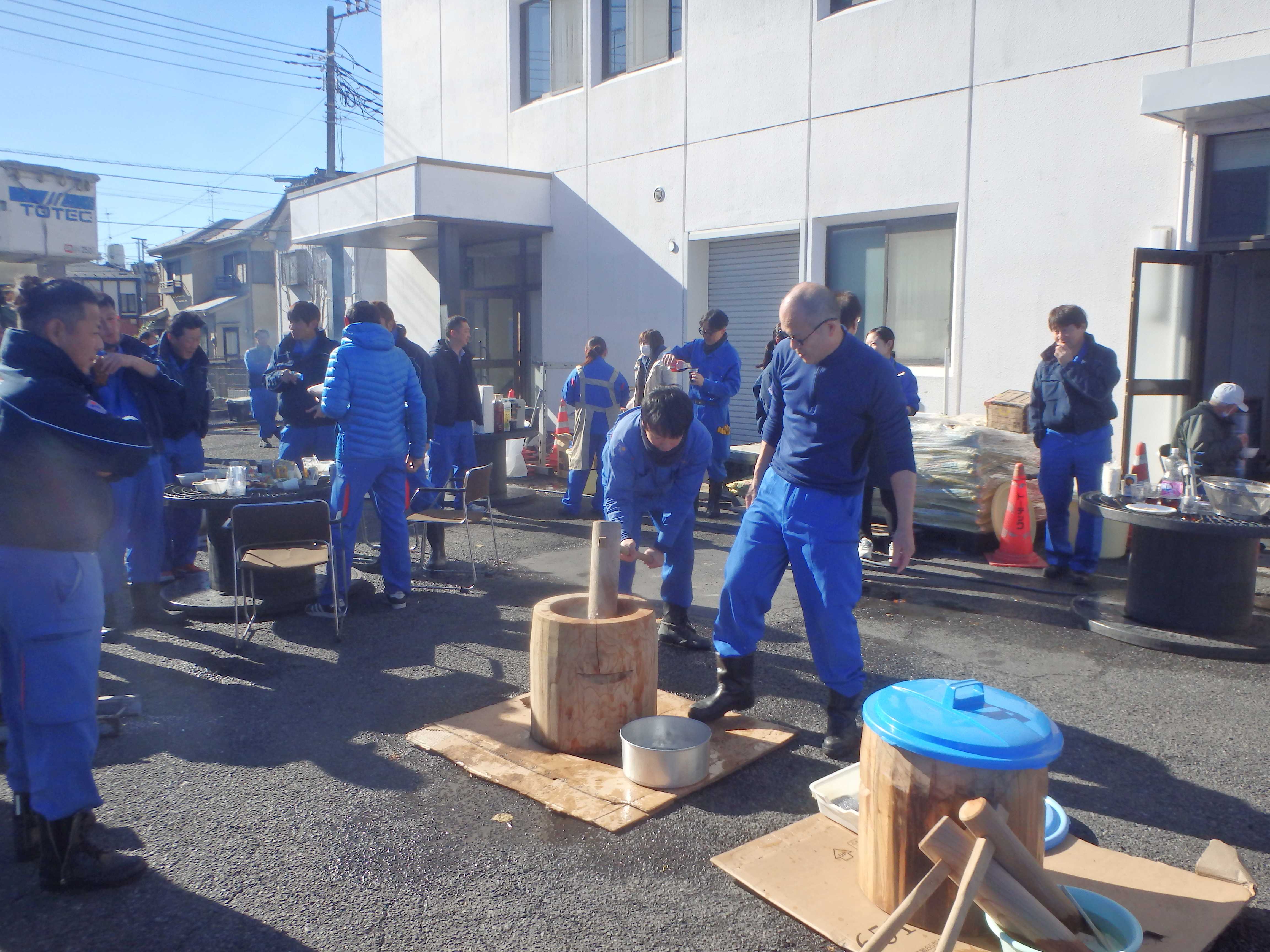 当日は、社員、協力会社員およびトーテックに携わる皆様にご参加をいただき、「安全」を祈念して餅つきを行いました。